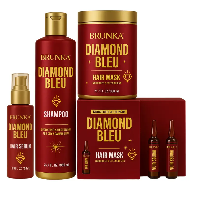 Découvrez le kit Brunka Diamond Bleu – soins capillaires hydratants et réparateurs. Shampooing, masque, sérum et ampoules pour cheveux secs, abîmés ou traités.