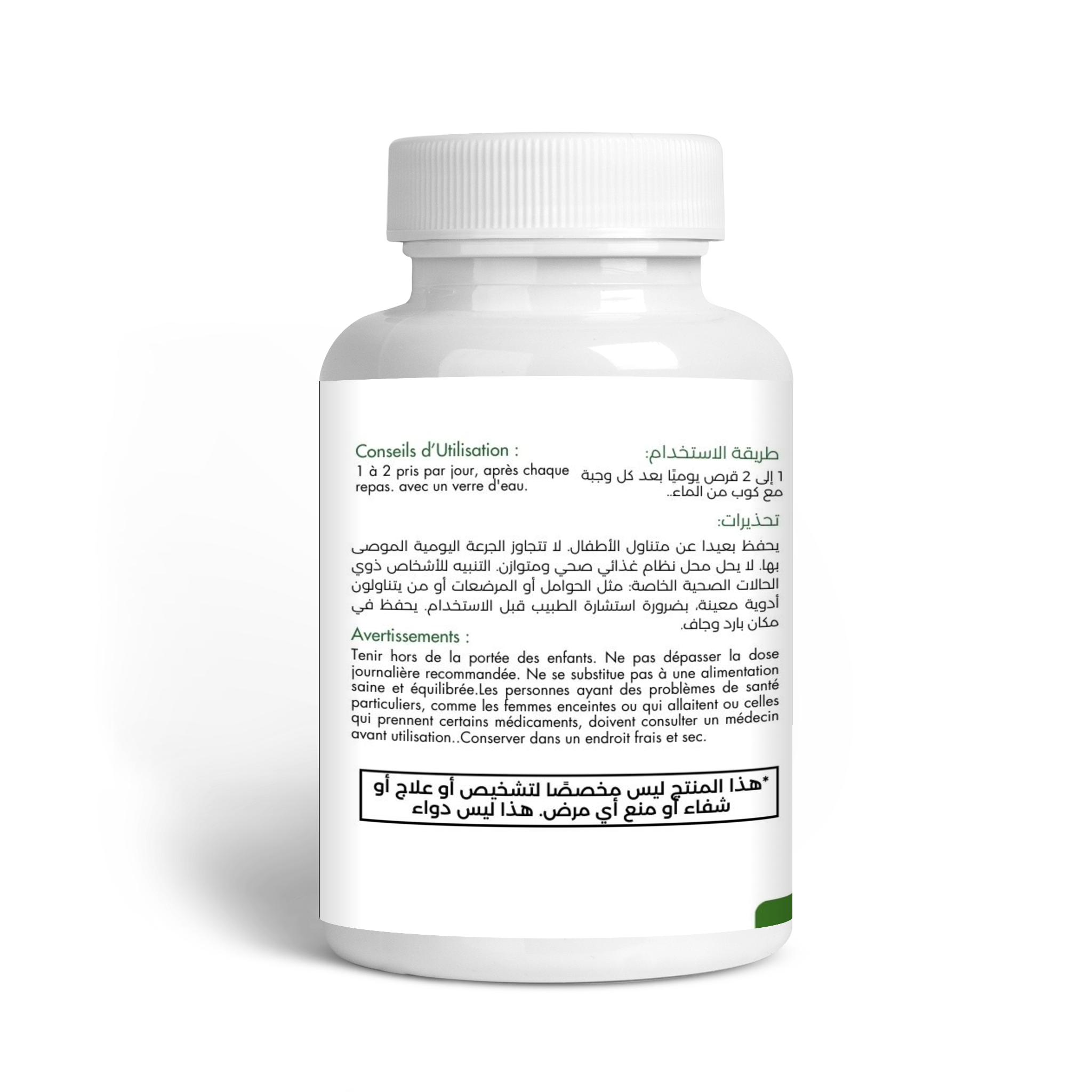 - لا تتجاوز الجرعة الموصى بها. استشر طبيبًا قبل الاستخدام إذا كان لديك مشاكل صحية معروفة أو إذا كنت تتناول أدوية. لا ينصح به للأطفال دون سن 18 عامًا. احفظه بعيدًا عن متناول الأطفال.